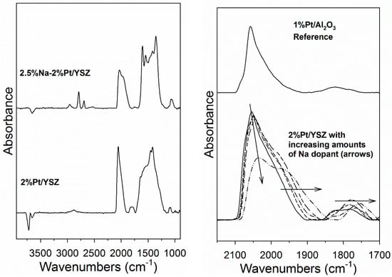 CO is an important probe molecule for bridging OH groups on active oxides, producing surface formates []. In Figure 4 (left) DRIFTS of adsorbed CO reveals, in addition of Pt carbonyl bands, ν(CH) and ν(OCO) asymmetric and symmetric stretching bands of formate. The ν(CH) band of the Na-doped catalyst were at lower wavenumbers, consistent with our earlier findings [,]. Therefore, DRIFTS—in agreement with EDS results—provides evidence that Na is located on the support. Figure 4 (right) demonstrates that adding Na affects the Pt-carbonyl bands, systematically shifting them to lower temperature. This may be due to a geometric or electronic effect, such as Na causing increased back-donation of electron density from Pt to the 2π* antibonding molecular orbitals of CO. This, in addition to EDS results, indicates that Na is interacting with Pt. The area intensity of the Pt carbonyl bands of the unpromoted and Na-doped 2% Pt/YSZ catalysts were virtually identical and double that of a 1% Pt/Al2O3 catalyst (completely dispersed), except for the 2.5% Na-doped case, which was 87% of the area of the other Pt/YSZ catalysts.