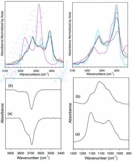 Adsorption of methanol to the surface of H2-activated 2% Pt/YSZ diminished ν(OH) bands associated with bridging OH groups located at 3800–3600 cm−1 (Figure 6, bottom left) and produced bands characteristic of methoxy species (Figure 6, bottom right), including ν(OC) bands within 1175–1000 cm−1 and ν(CH) bands at 3100–2700 cm−1. The ν(OH) band intensity was lower in the case of the Na-doped catalyst (Figure 6, bottom left, spectrum b), indicating that the decrease in bridging OH groups for Na-doped catalyst was lower; this in turn suggests that Na doping may decrease the bridging OH group population on the catalyst surface. Moreover, unlike those on the Na-doped catalyst, the bridging OH groups that reacted for undoped 2% Pt/YSZ (Figure 6, bottom left, spectrum a) contained a higher fraction of Type I (3725, 3750 cm−1) rather than Type II (3650, 3690 cm−1) species. Likewise, a higher fraction of the higher wavenumber Type I [] methoxy ν(OC) bands was observed for the undoped catalyst (Figure 6, bottom right, spectrum a), indicating that Na altered the ratio of adsorption sites to favor a higher fraction of sites with greater coordinative unsaturation.