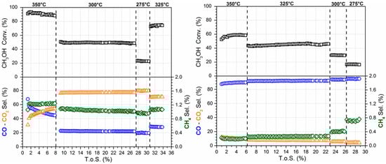 The effect of the time on-stream (TOS.) on the conversion and product selectivity is reported in Figure 7 (left) for the undoped catalyst. The conversion is stable at each tested condition, while an evolution of the product selectivity was detected in the first few hours at 350 °C. In fact, in this condition, CO selectivity decreases from 68% to 44%, while CO2 selectivity increases from 31% to 54%. In contrast, CH4 selectivity was stable at a value of 1.2%. Liu et al. [] have also observed that the CO selectivity decreases, while the CH3OH conversion and CO2 selectivity increases on 1Pt/30ZnO/Al2O3. The authors explained this phenomenon as an activation of the catalyst surface. At temperatures lower than 350 °C, both conversion and selectivities were stable with TOS. No deactivation phenomena were observed.