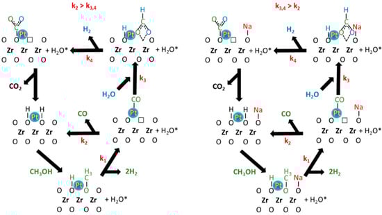 Proposed methanol steam reforming (MSR) pathways on (right) undoped Pt/YSZ and (left) Na-doped Pt/YSZ.