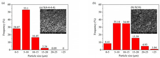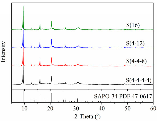 The distribution of the crystallization time in the intermittent hydrothermal treatment can also be adjusted by changing the frequency. At the same total crystallization time and the priority of short time in the initial stage of crystallization, samples S(4-4-4-4), S(4-4-8), S(4-12) and S(16) are synthesized at various crystallization cycles and analyzed to investigate the effect of the frequency in multi-stage crystallization on nucleation, growth, composition, and properties of SAPO-34. All the XRD patterns of the samples (Figure 4) are confirmed in agreement with that of the CHA-structure SAPO-34 (PDF 47-0617). The yields and the elemental compositions of Si, Al and P of the samples are similar, as shown in Table 3. This indicates that the crystallization time distribution of the intermittent hydrothermal treatment has very little influence on yields and elemental composition with the same total crystallization time. However, the D(50)s of the samples vary according to the frequency. They increase with an increase in time of continuous crystallization at high temperature. SEM images and particle size distribution histograms of S(4-4-4-4) and S(16) are shown in Figure 5. Both samples consist of crystals with a cubical shape, whereas their particle sizes are a little different. The particle size distribution of S(4-4-4-4) is more narrow than that of S(16). The same synthetic experiments of S(4-4-4-4) and S(16) are reproduced. As shown in Table 4, the particle size of S(4-4-4-4)s synthesized at the same condition is always smaller than that of S(16)s with standard deviations (Std. Dev.) of D(50) 1.62 and 1.27 μm, respectively. As reported by Xu et al. [24], the rate of crystal growth decreases faster than that of nucleation as the temperature decreases. So, in crystallization alternating heating and cooling, the temperature fluctuation has different effects on the nucleation and growth of crystals. The mass transfer is inhibited, and small crystals are perhaps difficult to dissolve and deposit on larger particles in the cooling process. Thus, the growth of crystals may be inhibited. More crystal nuclei are generated and remain stable. Therefore, the continuous crystallization at high temperature is beneficial for crystal growth, and the interruption of crystallization can restrain growth and promote nucleation. The particle sizes of the samples synthesized by alternating heating and cooling are smaller than those synthesized by the normal method. Further detailed research about the mechanism and kinetics of crystallization using alternating heating and cooling should be studied in future.
