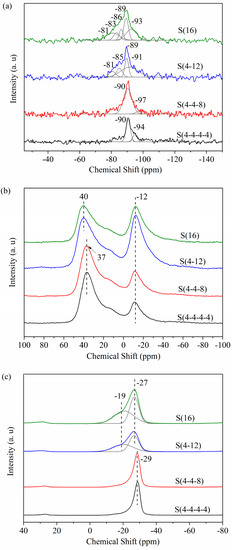 The solid-state magic-angle-spinning (MAS) NMR spectra were recorded with Bruker AVANCE III 400 (89 mm bore) spectrometer (Bruker AXS GmbH, Karlsruhe, Germany) operating at 9.397 T field strength using 4 mm o.d. ZrO2 rotors with a rotation speed of 5 KHz for 29Si MAS NMR, 9 KHz for 27Al MAS NMR, and 9 KHz for 31P MAS NMR. Single-pulse 29Si, 27Al, and 31P MAS NMR spectra of the samples were measured with relaxation time of 100, 2, and 5 s, respectively. The chemical shift of 29Si, 27Al, and 31P was externally referenced to Kaolinite, Al(NO3)3 aqueous solution, 1 mol/L, and NH4H2PO4 (ADP), respectively.