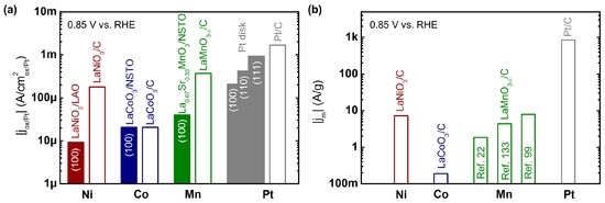 22] measured the ex situ valence of both Mn and Ni by XAS in the perovskite and concluded that Mn would be the more active element. Based on this argument, the activity should scale with the concentration of the active element as observed for Ba