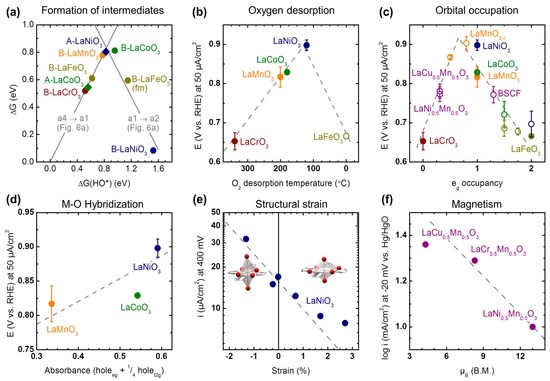 Figure 7d), where greater hybridization led to higher activity. For the back reaction of oxygen evolution, greater hybridization also led to higher activity in the LaBO