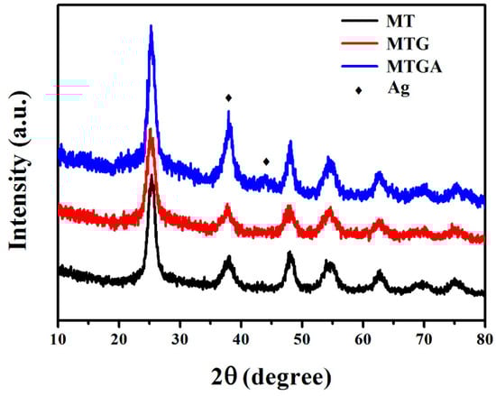 X-ray diffractometer (XRD) spectra of mesoporous TiO2 (MT), mesoporous TiO2/reduced graphene oxide (MTG) and mesoporous TiO2/reduced graphene oxide (RGO)/Ag (MTGA).