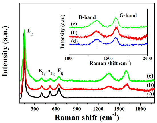 The resulting Raman spectra of MT, MTG and MTGA nanocomposites shown in Figure 2 highlights four particular peaks owed to anatase-phase TiO2 located at 146 (Eg), 399 (B1g), 517 (A1g) and 639 cm−1 (Eg), emerging in all of the samples [41]. Besides that, the inset of Figure 2 shows the Raman spectrum of GO with two manifest peaks at 1351 cm−1 (D-band) and 1605 cm−1 (G-band). The D-band originates from the disorder with structural defects caused in the process of the reduction of GO. Meanwhile, the G-band corresponds to the first order scattering of the E2g photon of sp2 C atoms of graphene [21,29]. Therefore, the intensity ratio between D-band and G-band (ID/IG) for GO was 0.88, signifying the existence of plentiful sp3 in the sample. The D- and G-bands of MTG and MTGA were approximately in the same position with GO. However, the ID/IG of MTG and MTGA decreased to 0.69 and 0.79, respectively, demonstrating the reduction of GO via the photo-assisted process [42,43].