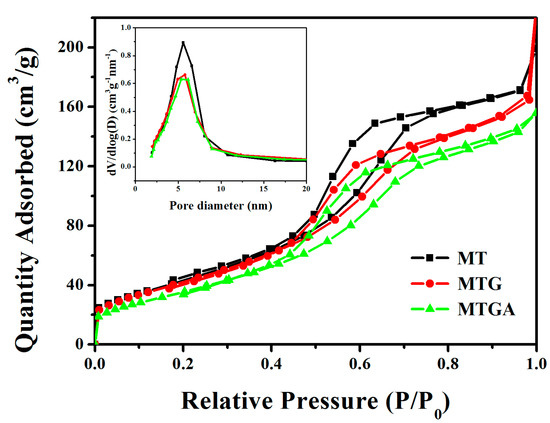 Nitrogen sorption isotherms and the corresponding pore size distribution curves for MT, MTG and MTGA.