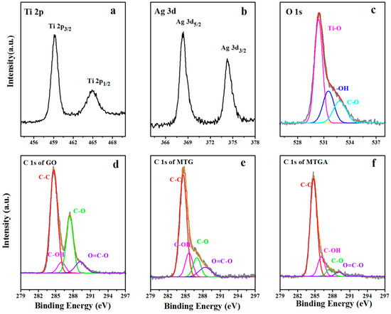 The surface elemental compositions and chemical states were inspected by X-ray photoelectron spectroscopy (XPS). Figure 4 shows the existence of the elements Ti, Ag, O and C in the MTGA ternary nanocomposite. In particular, as shown in Figure 4a, Ti 2p exhibits two typical peaks situated at 459.2 and 464.9 eV, noting the state of Ti4+ in anatase-phase TiO2 [44]. In Figure 4b, the two peaks at 368.35 eV and 374.1 eV for Ag 3d5/2 and Ag 3d3/2 can be assigned to metallic silver (Ag) [45]. The XPS spectrum of O 1s is divided into three peaks (532.25, 533.65 and 535.25 eV) attributed to the Ti-O bond in the TiO2 nanocrystal, the Ti-OH group on the surface of TiO2 and the –COOH species from CO2 adsorption, respectively [46]. Moreover, the fact that GO was reduced to RGO is proven by the Figure 4d–f. The XPS spectrum in Figure 4d highlights the abundance of diverse oxygen-containing functional groups, mainly including C–OH, C–O and O=C–O on the GO surface, corresponding to the peaks position at 286, 287.4 and 289 eV [47]. The attenuation of the oxygen-containing functional groups in Figure 4e,f of MTG and MTGA nanocomposites is remarkable, which certified the reduction of GO after light illumination [48,49,50].