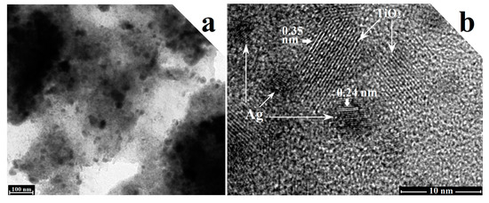 Figure 6 presents TEM and high-resolution transmission electron microscopy (HRTEM) images of MTGA nanocomposite, from which we can see that the TiO2 nanocrystals modified by the Ag nanoparticles adhere to the chiffon-like RGO nanosheets, besides that TiO2 possesses the mesoporous structure proven by Figure S2. The HRTEM image in Figure 6b unequivocally reveals that the specific interplanar spacings are 0.35 nm and 0.24 nm, respectively, belonging to the (101) facet of anatase TiO2 and the (111) plane of a cubic phase Ag, which prove the coexistence of TiO2 and Ag. Furthermore, Figure S4a–d displays the elemental mapping images based the selected area (Figure S3) on behalf of the Ti, O, C and Ag elements; it is further side evidence that Ag nanoparticles are deposited successfully by the photo-assisted process.