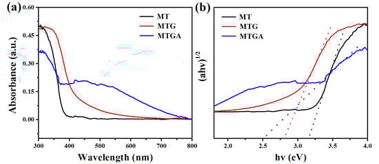Ultraviolet-visible diffuse reflectance spectrum (UV/Vis DRS) (a) and a plot of transformed Kubelka–Munk function versus the energy of light (b) for MT, MTG and MTGA.
