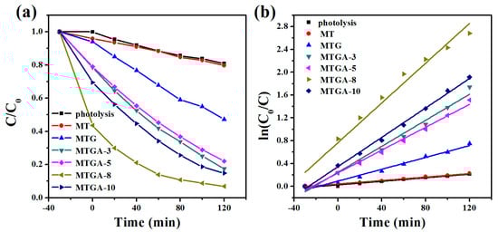 To clarify the separation ability of the photogenerated carriers of MTGA, an electrochemical impedance spectroscopy (EIS) Nyquist plot has been performed to discuss electrons’ separation and transfer [53,54]. As shown in Figure 10a, the typical electrochemical impedance spectra are presented as Nyquist plots, and it is observed that the semicircle of MTGA-8 is shorter than MTG’s, which demonstrates the decrease of the solid state interface layer resistance and the charge transfer resistance on the surface [55]. Therefore, the construction of the ternary structure could suppress the charge recombination, and thereby, the MTGA nanocomposite exhibits the enhanced photocatalytic performance.