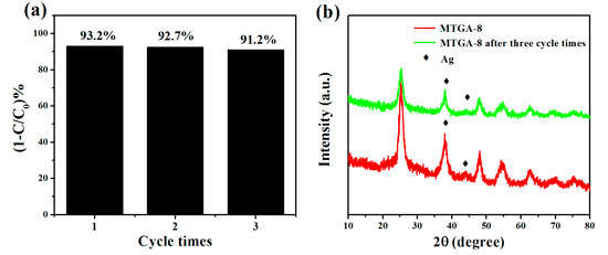 The stability of MTGA-8 is exhibited in Figure 9a; after three cycle times, the degradation rate reduces to 91.2%. Furthermore, the XRD spectrum of MTGA-8 after three cycle times shown in Figure 9b is also surveyed to determine whether the catalyst is deteriorated after the photocatalytic redox reaction. Compared to original MTGA-8, MTGA-8 after three cycle times remains as the typical anatase-phase TiO2, and no peak of the other valence state of Ti appears. Furthermore, the peaks of Ag nanoparticles still are located at 38.1° and 44.2°, and the intensity of peaks is slightly weaker. What is more, XPS spectra for the MTGA nanocomposite in Figure S5 can also prove that the MTGA nanocomposite retains its composition after the photoreaction. Therefore, it is confirmed that MTGA exhibits an excellent photocatalytic capacity and high stability.