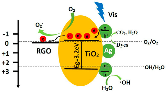 Based on the above analyses, a feasible photocatalytic mechanism over the MTGA ternary nanocomposite was proposed as depicted in Scheme 1. Under irradiation with visible light, Ag nanoparticles can work as an electron emitter to send out electrons (e−) to the CB of MT. The electrons can transfer from the CB of TiO2 to RGO nanosheets owing to the favorable energy level between the CB of the TiO2 and the work function of RGO (0.08 V vs. normal hydrogen electrode (NHE) for the Fermi level) [57], in which RGO serves as an electron collector and transporter. During the transfer process, the electrons can react with the dissolved oxygen molecule (O2) to get O2•−, and H2O and hydroxy (−OH) are absorbed by the rest of the h+ of the holes of the Ag nanoparticles to obtain the •OH. Besides, h+ itself has a strong oxidizing capacity. Therefore, O2•−, h+ and •OH can together promote the degradation of the dye. Without ignorance, the efficient electron transfer path among Ag nanoparticles, MT and RGO nanosheets can also play a synergistic interaction role, resulting in the significantly enhanced photoactivity of the MTGA ternary nanocomposite under visible light.