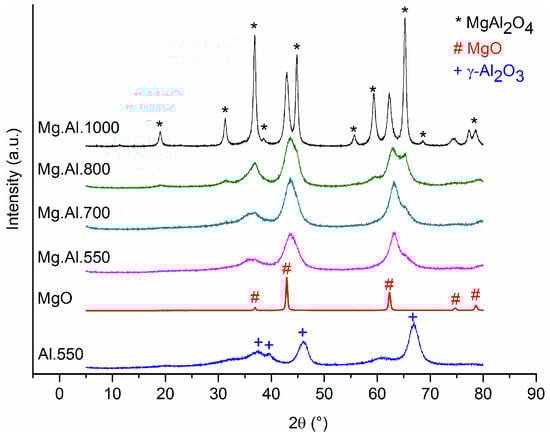First of all, the crystalline structures of the supports and catalysts can be revealed by X-ray diffraction. Figure 1 depicts the XRD patterns of MgO·Al2O3 mixed oxides (denoted as Mg.Al.X with X indicating the calcination temperature) obtained from hydrotalcite material with different calcination temperatures (550, 700, 800, 1000 °C). The patterns of MgO and Al.550 (boehmite calcined at 550 °C) are also displayed as references. When hydrotalcite samples are calcined at temperatures between 550 °C and 800 °C, the XRD patterns of the resulting Mg.Al.X samples show broad reflections at about 2θ = 43° and 63° which have 2θ values higher than those of periclase (cubic form of magnesium oxide, ICDD (International Centre for Diffraction Data) file No. 01-071-1176) but lower than those of γ-Al2O3 (ICDD file No. 00-010-0425). The patterns of periclase and γ-Al2O3 structures are clearly observed in MgO and Al.550 samples, respectively. This highlights the incorporation of smaller Al3+ cations into the bulk of the periclase (MgO) structure lattice, establishing a solid solution between MgO and Al2O3 (Mg-Al-O) [25,26]. A higher calcination temperature modifies such an incorporation which can be observed as a shift of reflections to lower 2θ values. Up to 800 °C, the pattern of such a solid solution is still observable. Besides, Mg.Al.700 and Mg.Al.800 show reflections (2θ = 31.3°; 37°; 45°; 55.5°; 59°; 65°) assigned to the formation of the MgAl2O4 phase (ICDD file No. 00-021-1152) at higher calcination temperatures [27]. At 1000 °C, no reflection of the solid solution can be observed while peaks assigned to periclase MgO and MgAl2O4 phases are sharp and characteristic, indicating the high crystallinity of those phases. Those results are in accordance with other studies [25,28,29] focusing on the thermal decomposition behavior of hydrotalcite, producing Mg-Al oxides and mixed oxides in solid solution or spinel structures, particularly when a low heating rate was applied.