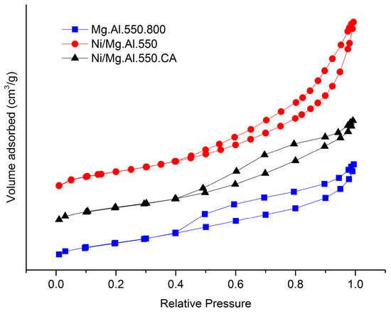 The N2 adsorption-desorption isotherms together with the BJH (Barrett-Joyner-Halenda) pore size distributions (PSD) of the Mg.Al.550.800 support and corresponding Ni catalysts are shown in Figure 3 and Figure 4, respectively. All isotherms exhibit type II curves with H3 type hysteresis loops according to the IUPAC (International Union of Pure and Applied Chemistry) classification, which reflects the contribution of the mesopores in the materials.