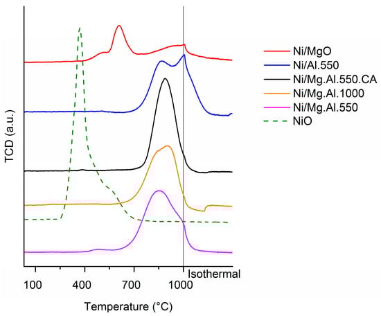 In comparison to Ni/Mg.Al.550, both Ni/Mg.Al.550.CA and Ni/Mg.Al.1000 show a shift in reduction peak maxima in their TPR profiles to higher temperature (900 °C) (Figure 5). Besides, they consume less hydrogen in the TPR experiment (Table 2), illustrating the formation of poorly reducible Ni2+ species that have higher interaction with the support frameworks [35,38].