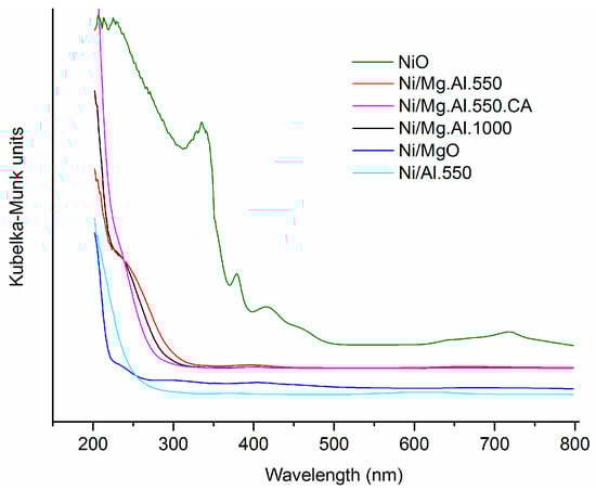 The coordination of the nickel (mostly Ni2+) species in the samples was examined by UV-Vis-DRS (Diffuse reflection spectroscopy). This technique is helpful for the identification of the nickel phases. No absorption can be seen in the support samples (not shown), suggesting that only Ni2+ species are sensitive at the chosen analysis conditions. The UV-Vis-DRS spectra of the Ni impregnated samples on different supports are shown in Figure 6. Those spectra show intense signals in the UV region of 250–350 nm, which relate to the O2− → Ni2+ charge transfer (CT) in the octahedral NiO lattice [42]. NiO shows strong absorption over the whole mentioned range which can be assigned to nonstoichiometric NiO containing some Ni3+ domains [42]. Mg.Al supported samples show shoulders in the range of 250–350 nm which cannot be found in the spectra of Ni/MgO and Ni/Al.550, suggesting weaker interaction of Ni species with the Mg.Al supports [30]. In comparison to Ni/Mg.Al.550.CA and Ni/Mg.Al.1000, a red-shift of the CT band of NiO is observed for Ni/Mg.Al.550, which points to the weakest interaction of Ni species and support among the studied samples. This explains the TPR results, which proved that Ni/Mg.Al.550.CA and Ni/Mg.Al.1000 have lower reducibility compared to Ni/Mg.Al.550 (Figure 5).