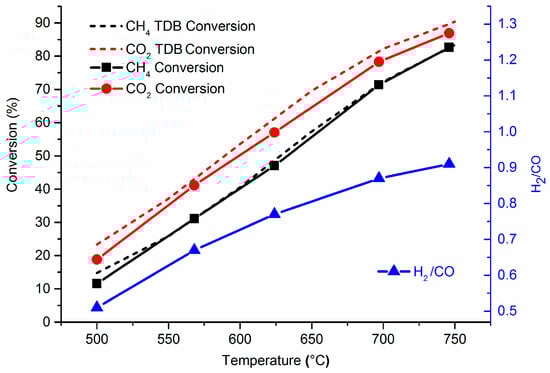 In order to verify such high activity of Ni/Mg.Al.550, additional DRM tests at lower temperature with the same WHSV were investigated. Figure 9 shows the excellent performance of Ni/Mg.Al.550 in comparison with the thermodynamic limitations [49]. The catalyst activates CH4 and CO2 already around 500 °C. It should be noted that DRM requires high temperatures to convert the reactants to syngas. According to the literature, the reaction starts at 350 °C, referred to by the thermodynamic calculations [49,50]. Moreover, remarkable conversions of methane and CO2 were observed only above 500 °C [13]. Some studies claimed the catalysts to be active in DRM at very low temperature (400 °C [51] or 450 °C [50]). However, in those studies more beneficial conditions for high catalytic activity compared to this study were applied (lower WHSV, higher content of active sites, or usage of noble metals). Therefore, the activity of Ni/Mg.Al.550 in this study is outstanding at low temperature considering its low Ni content and the high WHSV (85 L/(gcat × h)) in comparison with other investigations [3,8,52]. Figure 9 displays the effect of temperature on the H2/CO ratio. This ratio is always lower than unity at any set reaction temperature, which indicates the occurrence of the reverse water gas shift (RWGS) reaction, lowering H2 selectivity through the reaction with CO2 to form CO and H2O [1]. This reaction plays a more important role at lower temperature due to the thermodynamic equilibrium [1].