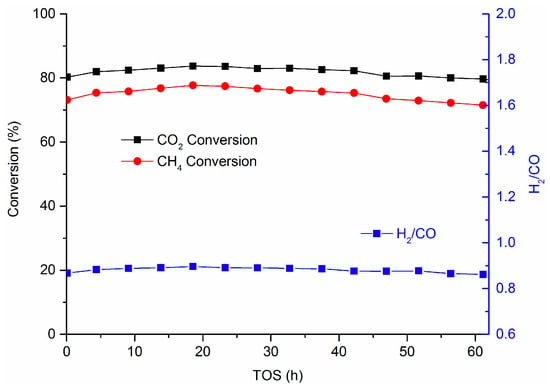 Long-term DRM was also carried out with Ni/Mg.Al.550.CA (Figure 11). The reaction was implemented at a considerably high WHSV of 170 L/(gcat × h) compared to the literature data [6]. The conversions of CH4 and CO2 are very close to the thermodynamic limitations for CH4 (82%) and CO2 (86%) [49]. The catalytic performance is almost unchanged after 60 h on-stream, representing high stability of the catalyst in the reaction. At any TOS, the CO2 conversion is about 8% higher than the CH4 conversion, illustrating the contribution of the RWGS reaction. The CO selectivity achieves a constant value around 100% (not shown) which is consistent with negligible carbon deposition (<1 wt %) measured after the reaction (Figure 10).