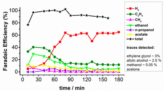 The main liquid phase product was ethanol. Besides, also n-propanol, acetate, ethylene glycol and formate (FE 2%–5%) and traces of allyl alcohol, methanol and acetone (FE < 1%), were quantified.