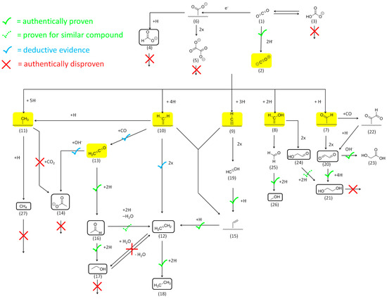 Proposed mechanism for CO2 electro-reduction on copper-based electrodes. Experimentally disproven pathways are indicated by a red cross. Detectable products are shown with a black frame, key intermediates are highlighted.