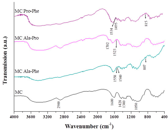 In the spectra of the treated amino acid celluloses, key bands from amino acids were observed. For instance, in the spectrum of the MC Ala-Phe sample, there was a band at 2120 cm−1 that was assigned to the stretching of the C=C bond in phenylalanine. Additionally, a band was observed at 1558 cm−1 due to the asymmetric stretching of C=O, and at 1540 cm−1, a band due to flexion of NH was observed. The position of these two bands of the C=O and NH groups in treated cellulose differed from those observed in pure amino acids, which were observed at 1551 and 1549 cm−1. Thus, this result suggests that polar groups of amino acids could interact with polar (O–H) groups in cellulose.