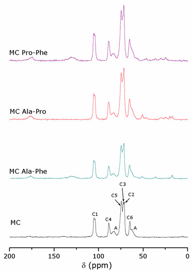 Figure 3 displays the 13C CP MAS NMR spectra of the cellulose samples. The peaks of cellulose were labelled according to the carbon number of the chemical structures reported in Figure 4. The presence of peaks labelled with A indicate that the cellulose sample contained some amorphous cellulose [22,23]. In the case of modified celluloses, the spectra were very close to that of untreated cellulose, but the signals of the amino acids were also observed. Three spectra of modified celluloses exhibited a peak at 174 ppm due to the carboxylic group of three amino acids (the carbon numbered 1 in the structure of the amino acids, Figure 4). In the case in which the spectra of the samples contained phenylalanine, a large NMR signal between 125 and 135 ppm was observed, which was due to the carbon of the aromatic ring in this amino acid (the carbons numbered 4, 5, 6 and 7, Figure 4). Aliphatic carbons were also present in three amino acids, and their NMR signals were observed within 15–50 ppm.