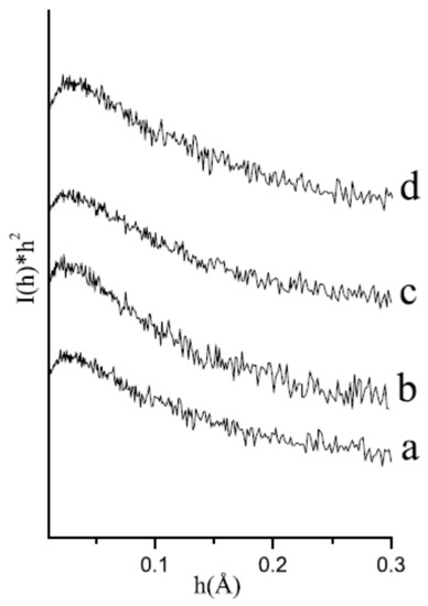 The SAXS profiles were acquired by a Kratky camera using Cu Kα radiation. The distance between the sample and linear proportional counter was 25 cm. Intensity, I(h), was measured for 9 min to determine statistical significance. The ITP program [35,36,37] was used to process SAXS data This program defines the scattering vector (h) as h = 4π sin θ/λ, where θ and λ corresponds to X-ray scattering angle and wavelength, respectively. The scattered intensity is expressed by I(q) = ΣiIi(0) exp[-(Rgiq)2/3], where Ii(0) indicates the scattering intensity at q = 0 of the scattering centre, i, with the radius of gyration, Rgi [36]. The fractal dimension of the scattering objects was evaluated from the slope of the curve log I(h) versus log(h) according to Porod’s law [38,39].