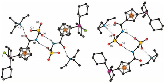 In addition, solid-state structures of 3b·CH2Cl2 and 4b were determined by single-crystal X-ray diffraction analysis. Views of the molecular structures are shown in Figure 1 and the relevant structural parameters for the phosphinoferrocene amidosulfonate anions are presented in Table 1. The ferrocene units in both structures adopt their usual geometry with similar Fe–C distances (cf. Fe–C(1–10): 2.036(2)–2.066(2) Å for 3b·CH2Cl2 and 2.032(2)–2.070(1) Å for 4b) and tilt angles not exceeding 5°. The substituents attached in the positions 1 and 1′ are diverted from each other, so that the ferrocene cyclopentadienyls assume conformations near to anticlinal eclipsed (compare τ angles with the ideal value of 144° [19]). Generally, the individual geometric parameters compare well with the values reported previously for compound 4d [7] and acid 1b [10]. In the pair, the structures of the anions differ mainly by the orientation of their CH2SO3 pendant groups. In the structure of 3b·CH2Cl2, this moiety extends above the amide plane toward the ferrocene unit, whereas in 4b, it is directed away from the ferrocene moiety (compare the dihedral angles C11-N1-C24-S of −88.5(2)° and 105.3(1)° in 3b·CH2Cl2 and 4b, respectively). Slight differences are observed also in the overall molecular conformation (compare angles τ and φ in Table 1) and in the lengths of the P–C bonds, which are longer in the free phosphine 4b than in the corresponding BH3 adduct 3b·CH2Cl2 [3b·CH2Cl2: P–C6 1.798(2) Å, P–C12 1.843(2) Å, and P–C18 1.840(2) Å; 4b: P–C6 1.825(1) Å, P–C12 1.873(1) Å, and P–C18 1.862(1) Å]. The cyclohexyl substituents assume chair conformations, which is clearly indicated by the ring puckering parameter θ being 0.0(2)° [2.2(2)] and 178.0(2)° [175.3(2)°] for the rings C(12–17) and C(18–23) in 3b·CH2Cl2 [4b], respectively (N.B. ideal chair requires θ = 0/180°, see ref. [20]). In all rings, the P–C bonds occupy equatorial positions.