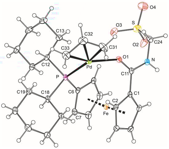 The formulation of 5b was unequivocally corroborated by X-ray diffraction analysis on the stoichiometric solvate 5b·CH2Cl2. A view of the complex molecule is shown in Figure 3, and the selected geometric parameters are given in Table 2. The allyl moiety {C31, C32, C33} in the structure of 5b is rotated by 69.7(4)° with respect to the plane defined by the palladium atom and the remaining ligating atoms P and O1, so that the carbon atom C32 in the meso position is diverted from the ferrocene ligand [21]. The individual Pd–C(allyl) distances decrease gradually from C31 to C33, reflecting the trans-influence of the donor atoms located opposite the allyl moiety (P > O) [22,23].