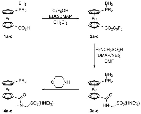 Compounds 1a–c were prepared in analogy to the amidosulfonate donors A–C mentioned in the Introduction except that their oxidation-sensitive phosphine moieties were protected in the form of BH3 adducts [18] during the synthesis (Scheme 2). In the first step, phosphinocarboxylic acid-borane adducts 1a–c were reacted with pentafluorophenol in the presence of 1-ethyl- -3-[3-(dimethylamino)propyl]carbodiimide (EDC) and 4-(dimethylamino)pyridine (DMAP) to afford the corresponding esters 2a–c. These active esters were, in turn, reacted with aminomethanesulfonic acid in a mixture of N,N-dimethylformamide (DMF) and triethylamine to give the target ligands in their P-protected form, compound 3a–c. In the last step, the borane protecting group was removed by heating these borane adducts in neat morpholine (65 °C/16 h) and the resulting free phosphines 4a–c were isolated by column chromatography using a NEt3-pretreated silica gel column to avoid cation exchange. The target ligands 4a–c as well as all reaction intermediates were characterized by NMR and IR spectroscopy, electrospray ionization (ESI) mass spectrometry and by elemental analysis.
