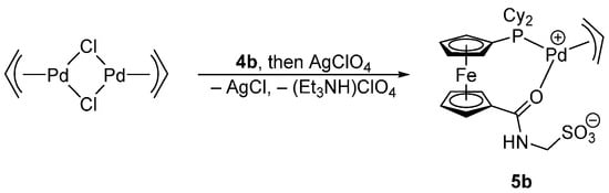 The reaction of [Pd(μ-Cl)(η-C3H5)]2 with ligand 4b chosen as a representative and then with silver(I) perchlorate proceeded under cleavage of the chloride bridges in the dimeric Pd(II) precursor and removal of the Pd-bound chloride to afford the zwitterionic (η3-C3H5)Pd(II) complex 5b wherein the phosphinosulfonate anion Cy2PfcCONHCH2SO3− coordinates through its phosphine substituent and the amide oxygen, forming an O,P-chelate ring (Scheme 3). The coordination of the phosphine group in 5b was manifested through a shift of the 31P NMR resonance to a lower field (the 31P NMR coordination shift, ΔP = δP(complex) − δP(free ligand), was 36.0 ppm), whereas the shift of the amide C=O vibration in the IR spectrum by 65 cm−1 to lower energies suggested that the amide oxygen is involved in coordination to the (η3-C3H5)Pd fragment rather that the anionic sulfonate moiety [7].