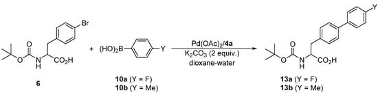 Attempted coupling of 4-bromophenyl alanine substrate 6 with 10a and 10b (Scheme 6) under similar conditions proceeded satisfactorily, producing the biphenyl amino acids 13a and 13b, respectively, in approximately 90% yields (Table 6). Unfortunately, these products could not be separated from unreacted 6a either by chromatography or crystallization due to a similar retention characteristic and reluctance to crystallize, respectively. Upon increasing the amount of the catalyst to 1 mol. %, the reaction achieved complete conversions within 6 h at 40 °C, which in turn allowed for the isolation of the pure products 13 in good yields. Notably, NMR analysis of the crude reaction mixtures revealed that the Boc-protecting group is stable under the reaction conditions, which is indeed manifested in the good yields.