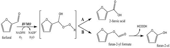 Some previous studies have shown that BVMOs can also accept aldehydes as a substrate [18,19,20,21]. In these cases, the formed product (the respective acid and/or ester) varied depending on the enzyme and substrate employed. The ability of BVMOs to perform Baeyer-Villiger oxidations and other oxygenations lies in the ability of these enzymes to form a reactive peroxyflavin intermediate. In the case of a Baeyer-Villiger oxidation, the attack of the peroxyflavin on the carbonylic carbon results in the formation of a Criegee intermediate. Depending on the type of substrate and the microenvironment formed by the flavin cofactor, the nicotinamide cofactor, and active site residues, the Criegee intermediate will decay to form the final oxygenated product. In the case of aldehydes, both the typical Baeyer-Villiger product (the formyl ester) and/or the acid product can be formed (see Figure 1). To the best of our knowledge, there are no previous reports on enzymatic Baeyer-Villiger oxidations of HMF or related furanoid aldehydes.