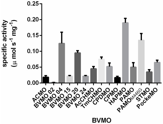 To establish whether BVMOs display activity on furans, we tested 15 BVMOs. With our previously developed expression strategy in which a BVMO is expressed as a PTDH fusion protein, or by using the pBAD expression vector, good to excellent expression levels of all studied BVMOs could be achieved. Because the proteome of the expression host, Escherichia coli, is known to be void of any BVMO, cell extracts were used to screen for BVMO activity on the test furan, furfural. As a control, the extract of uninduced cells was also used. While we first attempted to measure the rate of furfural conversion by monitoring NADPH consumption, we noted that uninduced cell extracts also showed significant background activity. This is probably due to endogenous NADPH-dependent aldehyde reductase activity present in E. coli. In fact, using HPLC analysis, we could confirm that E. coli cell extract can be used to reduce HMF into the corresponding alcohol, 5-(hydroxymethyl)furfuryl alcohol. To avoid such false positive results, we decided to measure BVMO activity by monitoring oxygen consumption upon the addition of a substrate. Figure 2 shows the observed specific activities.