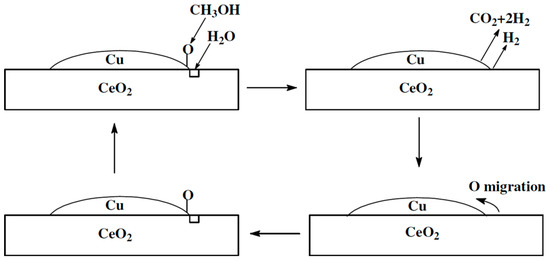 Other alkaline oxides such as CeO2 and ZrO2 can also be added into the Cu-based catalysts as promoters. The addition of ceria oxide is beneficial for maintaining copper dispersion and coke suppression due to its oxygen storage property [27]. Cu/CeO2 catalysts have been proven to have superior activities for steam methanol reforming compared to industrial Cu/ZnO catalysts [28]. The addition of cerium to Cu/ZnO/Al2O3 catalysts can effectively improve the activity and hydrogen selectivity. In any case, the content of CO in the reformate can be kept low due to the suppression of methanol decomposition and reverse water-gas shift reactions [29]. Men et al. [30] reported that the activities of Cu/CeO2/Al2O3 catalysts were dependent on the loading of Cu. They found that while the molar ratio of Cu and Ce in the catalyst increases from 0.1 to 0.9, the catalytic activity monotonously decreases. They attributed this to the fact that copper disperses preferentially on the ceria surface at low copper loading and the aggregation of copper particles occurs at high copper loading. Thermal desorption spectroscopy (TDS) results indicate that the decrease of copper loading and increase of ceria loading can enhance the basicity of the catalyst [31]. The methanol steam reforming reaction was believed to occur at the Cu/CeO2 interface and the proposed reaction mechanism is shown in Figure 4 [30,32]. It includes four steps to fulfill a catalysis cycle, which are the adsorption of methanol and water at the Cu/CeO2 interface, followed by the surface reaction and the oxygen reverse spillover (the migration of surface oxygen from CeO2 to Cu), and, finally, the regeneration of partially oxidized copper and oxygen vacancies. ZrO2 added to Cu/ZnO catalysts can also enhance the copper dispersion on the catalyst surface and thus lead to higher activity [33,34]. Moreover, the introduction of ZrO2 into Cu/ZnO improves the reducibility and stability of the catalysts [35].