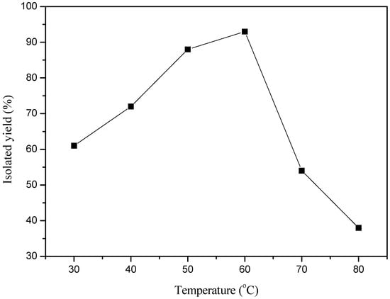 The effect of temperature on the synthesis of indolyl 4H-chromene. Reaction condition: 1a (1 mmol), 2a (1 mmol), 3 (1 mmol), [EMIM][BF4] (5 mL), MML (60 mg, protein content), 3 h.