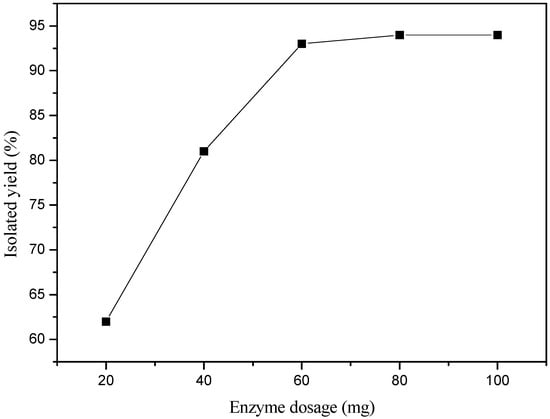 The effect of enzyme dosage was also studied (Figure 2). It could be found in Figure 2 that the yield increased along with the increasing amount of MML from 20 to 60 mg. But the yield could not be enhanced by further increasing the dosage of MML. Therefore, 60 mg of MML turned out to be sufficient to catalyze the reaction.