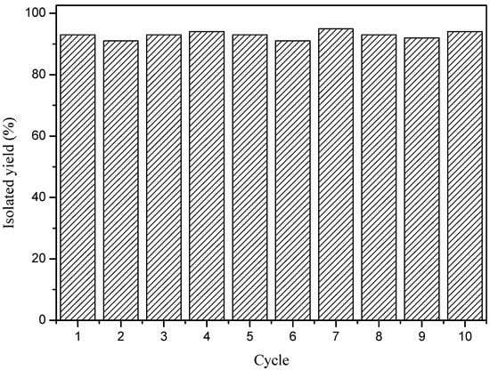 Another significant property of ILs is their reusability, which is responsible for their environmental friendliness character and the industrial applications. In this study, the IL was recovered by filtration from the reaction system and washed with cold ethyl acetate to remove the residual substrates. It was then dried under vacuum and reused for the next cycle. The results shown in Figure 3 indicated that the recovered IL was recycled for ten runs without any negative effect on the yield of indolyl 4H-chromene.