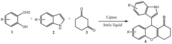 It is known that room temperature ionic liquids (ILs) have been broadly used as attractive media in enzymatic reactions for their distinct features, such as the negligible vapor pressure, high thermal stability, and excellent biocompatibility [30,31]. Another advantage of ILs is that they can be easily recovered as the reaction media in biocatalysis [32,33]. However, only a few studies have used ionic liquid as the reaction media for enzyme catalytic promiscuous reactions. Sharma et al. reported a novel combination of enzyme and ionic liquid [HMIM] Br for the oxidation of aryl alcohols/acetates [34]. Yu and co-workers exhibited the asymmetric cross aldol reactions of aromatic aldehydes with ketones catalyzed by lipase in [BMIM][PF6] [35]. As part of our investigation on the enzymatic synthesis of heterocyclic compounds, a mild and efficient method for the synthesis of indolyl 4H-chromenes via a MCR catalyzed by lipase in ionic liquid (Scheme 1) is herein reported for the first time.