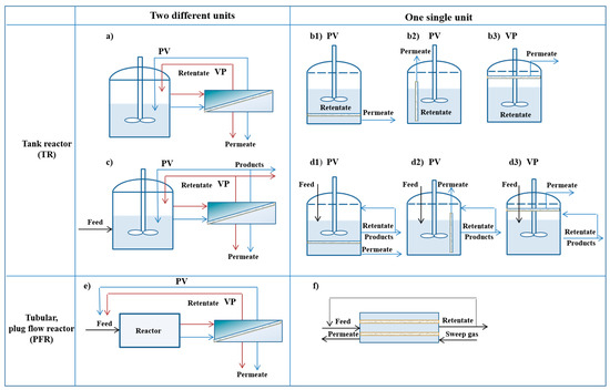 Examples of reactor-membrane separator configurations. TR with external separation unit, TR+PV or TR+VP (a); TR with internal flat membrane in PV mode, TRPV (b1), or VP mode TRVP (b3) and tubular membrane, TRPV (b2); (c) recycle continuous stirred tank reactor (CSTR) with external separation unit, CST+PV or CST+VP (c), or internal unit, CSTPV or CSTVP (d1–d3); PFR with external separation unit, PFR+VP or PFR+PV (e) or internal unit, PRFVP (f).