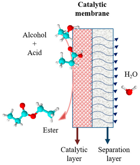 When the selective and catalytic functions are integrated into one single layer, specific material properties are required: in fact, to attain high water selectivity, the diffusion of all components except water through the catalytic membrane should be low, while for an efficient use of the catalyst, high diffusion of the reactants is required. In the esterification reaction of an acid with an alcohol, for example, the reactants diffuse into the catalytic layer to be converted to ester and water (see Figure 3); then the ester returns to the liquid mixture whereas the water is removed in situ. Consequently, the hydrolysis of the ester is limited while the conversion is enhanced compared to the values obtained using a non-catalytic MR [88,92,93]. On account of this, Zhang et al. employed a catalytically active PV membrane to improve the conversion of acetic acid in the esterification reaction with n-butanol. The membrane was synthesized by coating a porous catalytic layer containing polyvinyl alcohol and ion-exchange resins on a dense polyvinyl alcohol (PVA)/polyethersulfone (PES) separation membrane. Although the coating of a catalytic layer on the separation layer would enhance the permeability but, at the same time, limit the selectivity of the catalytically active membrane, the system was active both from a catalytic and a separation functionality point of view. In fact, the conversion of acetic acid reached a value of 91.4% in 20 h at 85 °C with an enhancement of about 27%, considering that, with this condition, the equilibrium conversion is only 71.9% [94].