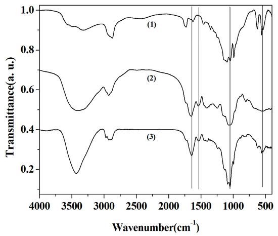 Cu3(PO4)2·3H2O, laccase and laccase-incorporated nanoflower were characterized by FTIR spectrum in the region of 400–4000 cm−1 to certify the presence of laccase in the nanoflowers (Figure 2). The vibration bands of PO43− can be seen at 1053 cm−1 and 556 cm−1 (Curve 1 and Curve 3 in Figure 2) [27]. The amide I and II bands of the laccase can be observed at 1646 cm−1 and 1533 cm−1 (Curve 2 and Curve 3 in Figure 2) [28]. The amide I band at 1646 cm−1 derives mainly from the C=O stretching vibrations of the peptide linkages in laccase. The amide II at 1533 cm−1 is primarily attributed to in-plane NH bending vibration and CN stretching vibration in laccase [29]. These results verify existence of laccase in the nanoflowers.