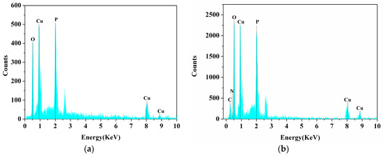 Energy-dispersive X-ray spectroscopy (EDS) spectrum of Cu3(PO4)2·3H2O matrices without laccase (a) and laccase-incorporated nanoflower (b).