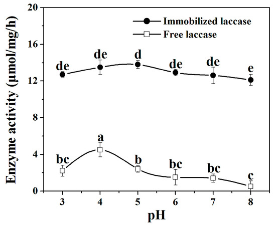 Effect of pH on the enzyme activity of laccase and laccase in the nanoflowers. Reaction conditions: trans-resveratrol 2 mmol, n-butanol (30 mL), Na2HPO4–sodium citrate buffer (15 mL) (pH 3–8), immobilized laccase or free laccase (enzyme content: 5 mg), reaction temperature: 45 °C. Post hoc all pairwise comparisons for the specific activities of free or immobilized laccase at different pH values were performed using Tukey’s test (p < 0.05). Means with the same letter are not significantly different. Letters (a, b, c, d, e) identify different statistically significant groups (Tukey’s test, p < 0.05).