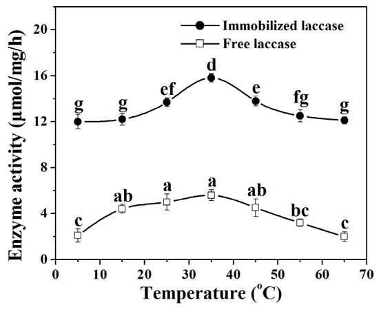 Effect of temperature on the activity of free laccase and laccase in the nanoflowers. Reaction conditions: trans-resveratrol 2 mmol, n-butanol (30 mL), Na2HPO4–sodium citrate buffer (15 mL) (pH 5.0 for immobilized laccase, pH 4.0 for free laccase), immobilized laccase or free laccase (enzyme content: 5 mg), reaction temperature: 5–65 °C. Post hoc all pairwise comparisons for the specific activities of free or immobilized laccase at different temperatures were performed using Tukey’s test (p < 0.05). Means with the same letter are not significantly different. Letters (a, b, c, d, e, f, g) identify different statistically significant groups (Tukey’s test, p < 0.05).