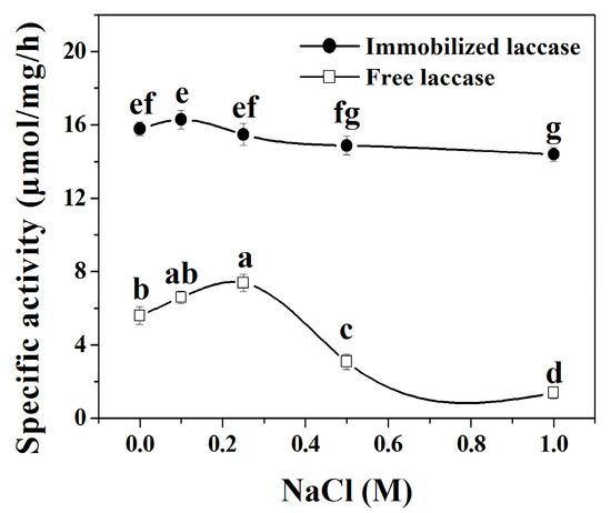Effect of NaCl concentration on the activity of laccase and laccase in the nanoflowers. Reaction conditions: trans-resveratrol 2 mmol, n-butanol (30 mL), Na2HPO4–sodium citrate buffer (15 mL) containing 0.0–1.0 M NaCl (pH 5.0 for immobilized laccase, pH 4.0 for free laccase), immobilized laccase or free laccase (enzyme content: 5 mg), reaction temperature: 35 °C. Post hoc all pairwise comparisons for the specific activities of free or immobilized laccase at different concentrations of NaCl were performed using Tukey’s test (p < 0.05). Means with the same letter are not significantly different. Letters (a, b, c, d, e, f, g) identify different statistically significant groups (Tukey’s test, p < 0.05).