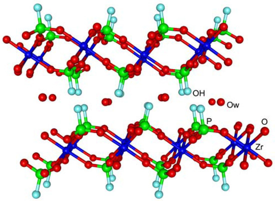 2O. Each layer consists of a plane of zirconium atoms, bridged by monohydrogenphosphate groups, lying above and below the main plane of Zr atoms [