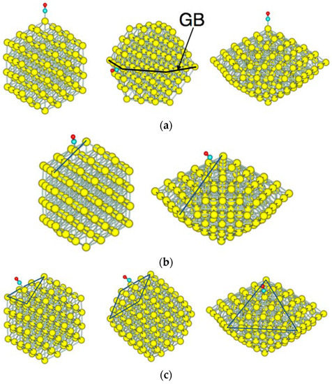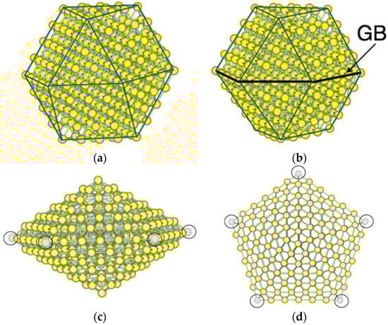 Figure 1 shows examples of the morphology of NPs adopted in this study. A truncated cuboctahedron structure is used for a single-crystal nanoparticle. This structure has a symmetry of Oh. Hereafter, we call the single-crystal NP as “Oh-NP”. In the Oh-NP structure, (111) faces are always located next to (100) faces. For twin NPs, two types of structures are adopted; one is a single twin structure, which has a single grain boundary, and the other is a multiple twin type, which has five-fold twinning. Both types of twin NPs were experimentally observed [13,14]. The single-twin NP has the symmetry of D3h (hereafter, referred to as “D3h-NP”). In the D3h-NP structure, the single twinning results in the grain boundary at which the (111) and (100) faces are next to the (111) and (100) faces, respectively. The five-fold twin NP is a decahedron and has the symmetry of D5h (hereafter, referred to as “D5h-NP”). The D5h-NP is composed of five distorted tetrahedral units, which are joined at a common edge and each of which shares two of their (111) faces as twinning planes.