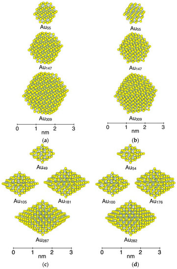 Size of model Au NPs. (a) Single-crystal Oh-NPs; (b) simple twin D3h-NPs; (c) multiple twin D5h-NPs with the spin state of Sz = 1/2; and (d) multiple twin D5h-NPs with the spin state of Sz = 0. Three generations are categorized for these NPs. The first generation includes NPs of less than 100 atoms and their diameters are about 1 nm. The second generation includes NPs composed of 100 to 200 atoms and their diameters are about 2 nm. The third generation includes NPs of around 300 atoms, and their diameters are about 3 nm.